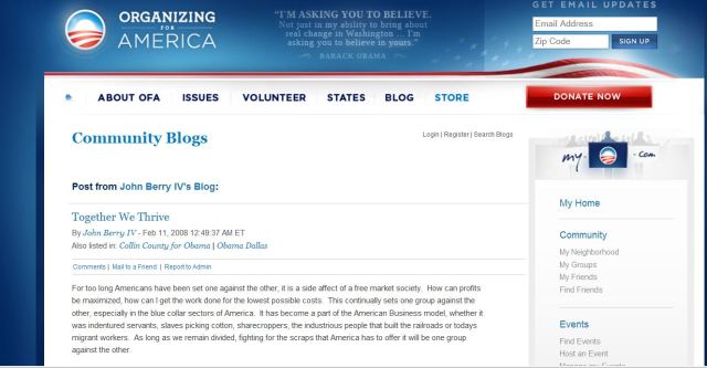 Yet the “Together We Thrive” slogan dates back to a post to Obama’s own Organizing for America in a Feb. 11, 2008 post by self-described “globalist” John Berry IV.