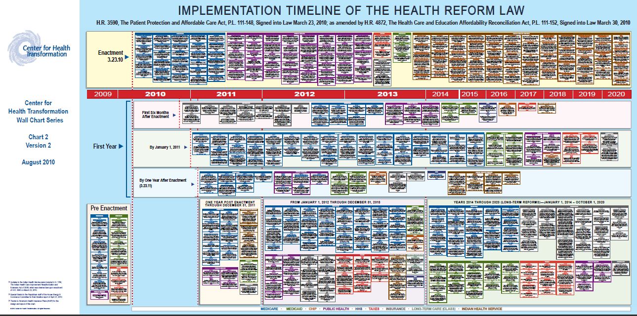 Implementation timeline through 2020 for Obamacare (see it at the Center for Health Transformation Here):