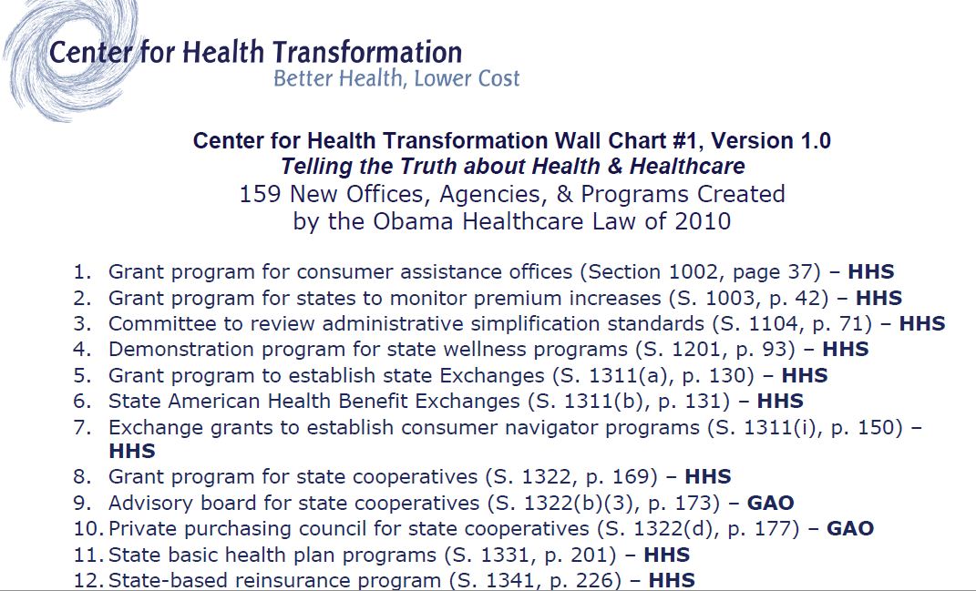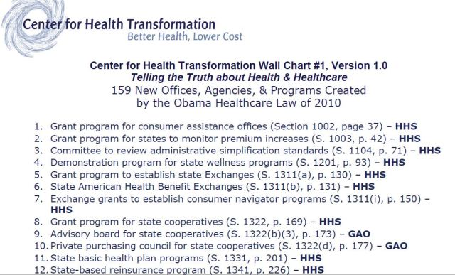 Obamacare adds 159 new agencies, offices, and commissions to an already bloated federal government (Get the entire 159 PDF chart at the Center for Health Transformation Here):