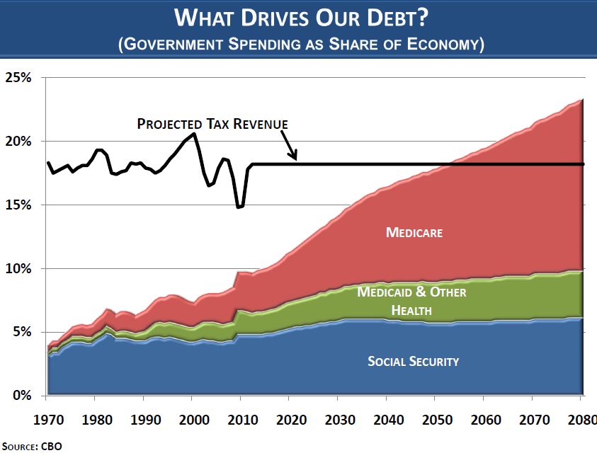 Here is detail on how the three biggest (unreformed) entitlements will drive the debt. If he wins, Obama will nto reform these programs. In fact, it is certain the exponential curve will grow.