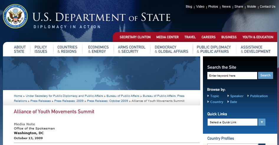 The very public United States of America Department of State involvement in the 2009 Alliance of Youth Movements is shocking. Equally as shocking is the list of co-sponsors.