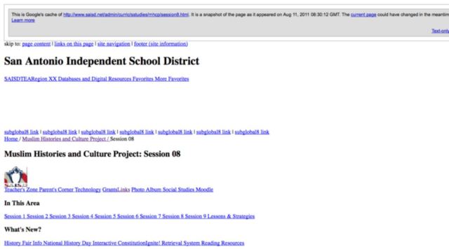 August 18, Geller, at her own Atlas Shrugs, wrote at length with detail about the Texas school systems muslin indoctrination program and linked to the actual Web Site for the complete San Antonio Independent School District Islam program. I reviewed the entire complete and very well done Site. You cannot. Within days, the Islam Program pages were taken down. But there is A cache system that stores all Web pages. However, those cached pages were also taken down. Before that happened, I downloaded: