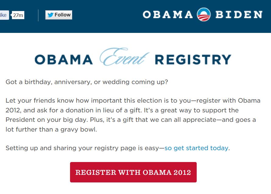 Let your friends know how important this election is to you—register with Obama 2012, and ask for a donation in lieu of a gift. It’s a great way to support the President on your big day. Plus, it’s a gift that we can all appreciate—and goes a lot further than a gravy bowl.