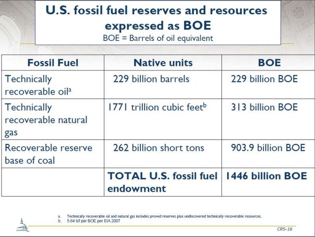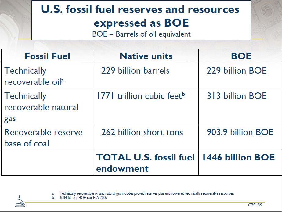 Including these zones, America has the largest Barrel of Oil Equivalent in the world. Let me say that again. America has the largest Barrel of Oil Equivalent (BOE) in the world—1446 billion BOE. Nobody else is close. Our technically recoverable oil is 229 billion BOE or about one fifth of the technically recoverable oil in the world. That is likely to double in the next few years to 500 billion BOE. Don’t be surprised if we have a tremendous increase in our world leading 904 billion BOE natural gas. This thrilling table is from an October, 12 2009 presentation by Energy Section Research manager, Gene Whitney, at the Congressional Research Service.
