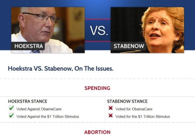Pete served 18 years in the House of Representatives. He established a very conservative voting record and, refreshingly, a reputation for ignoring political correctness. Pete has a unique and effective way of contrasting his stand on the issues with Senator Stabenow. Go to the page. It won’t take long. You’ll learn a lot. The issues are: Spending, Abortion, Budget, Conservative Ideology, Liberal Ideology, Guns, Labor, Social, and National Security/Foreign Policy. Here is how it looks: