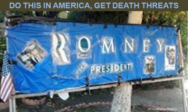 In 2011 we were treated to mobs in Madison, Wisconsin and Columbus, Ohio followed later that year by the Obama/SEIU/ACORN Occupy Wall Street. This year has brought a smattering all that and another thing entirely—the intimidation of active engaged conservatives. A current example is this Godfather Politics story of death threats and vandalism a couple is receiving over this (now taped and patched up) home made Romney sign in their yard: