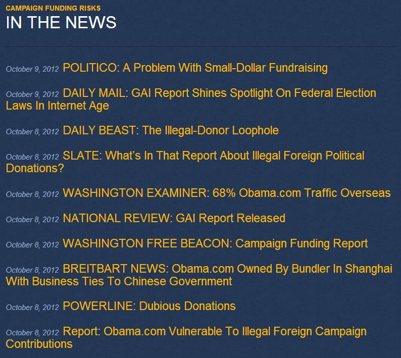 - October 8, 2012 Report: Obama.com Vulnerable To Illegal Foreign Campaign Contributions
