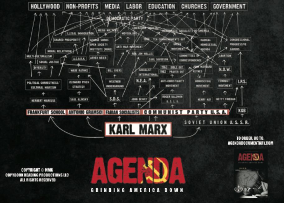 Weeks before Rosebud talked, a patriot and former Idaho legislator, Curtis Bowers, released his documentary Agenda: Grinding America Down – How Liberals Indoctrinated The US. Agenda documents a century of leftist work in America to gradually replace freedom with tyrannical Socialism. It show this detailed chart that traces the work to replace God with Socialism from Karl Marx right to this current generation of committed hard leftists that gave us Barak Obama.