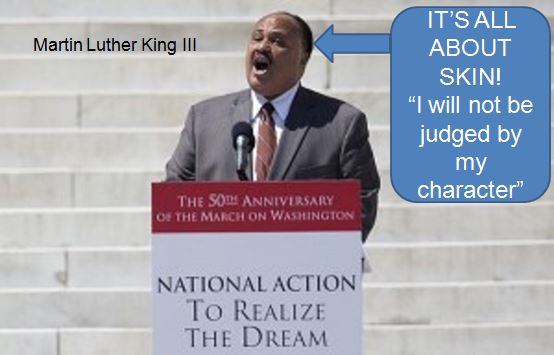 Not the least of Dr. King’s dreams was “that my four little children will one day live in a nation where they will not be judged by the color of their skin but by the content of their character.” This child who bears his name is not interested in character but only skin color: