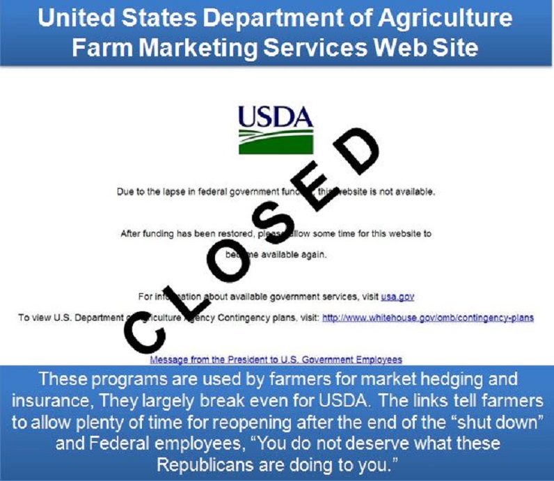 Federal Agencies were closed selectively. For example, the USDA Farm Marketing Services Agency was closed in every county in America. Every phone was answered by a computer with a message essentially saying, “tough.” Examine the USDA Farm Marketing Services Web Site: