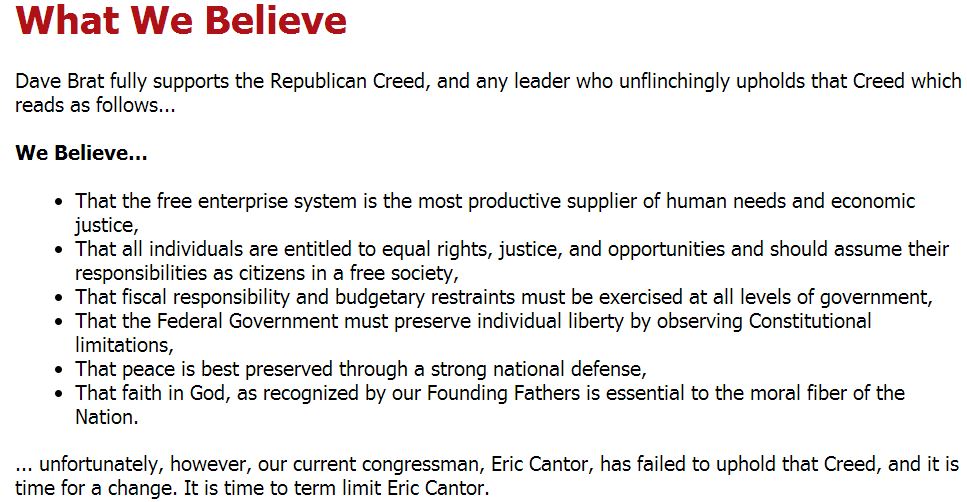 Well, OK. The RPV Creed is just about as ignored by the RPV as any other State Republican party. But they did keep the largely ignored Creed and posted it on their Web Site where it was discovered by Dave Brat. Brat, as most of America now knows, is the economics professor who defeated U. S. House Majority Leader Eric Cantor in the Virginia Republican Primary Tuesday.