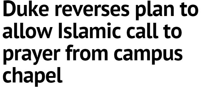 “[A]fter announcing that Islamic students would be broadcasting a weekly call to prayer from the Duke Chapel bell tower, Duke University officials abandoned that plan Thursday, citing the furor the move had created.”